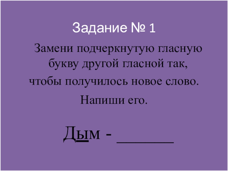 Задание № 1 Замени подчеркнутую гласную букву другой гласной так, чтобы получилось новое слово. Напиши его. Дым - ______