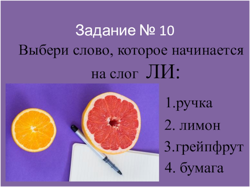 Задание № 10        Выбери слово, которое начинается на слог ЛИ:
