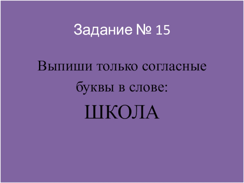 Задание № 15        Выпиши только согласные буквы в слове: ШКОЛА