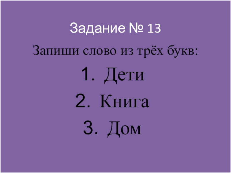 Задание № 13        Запиши слово из трёх букв: Дети Книга