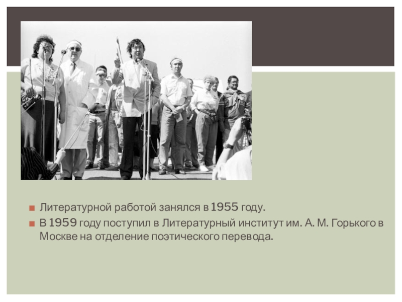 Слайд 3Сочинительством Олжас начал заниматься с 1955 года. На счастливый поворот в