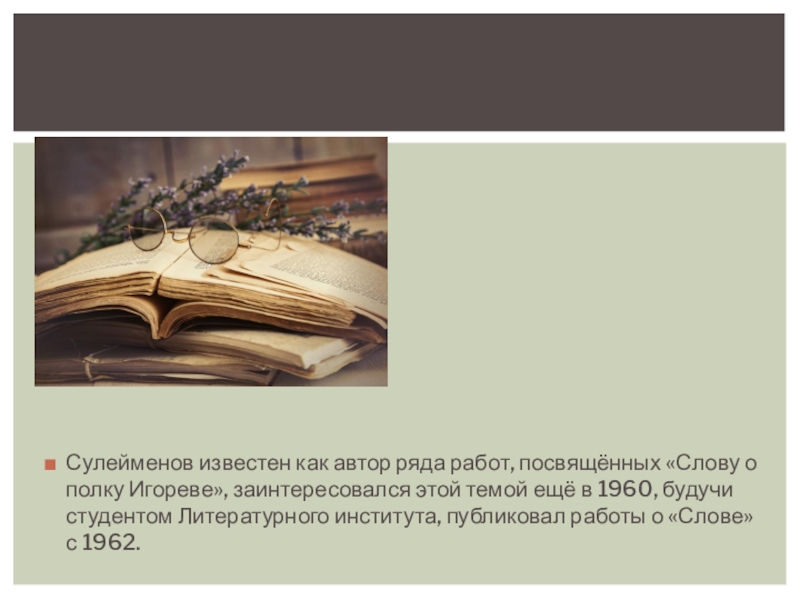 Слайд 19Сулейменов известен как автор ряда работ, посвящённых «Слову о полку Игореве»,