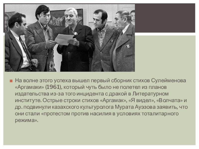 Слайд 14На волне этого успеха вышел первый сборник стихов Сулейменова «Аргамаки» (1961),