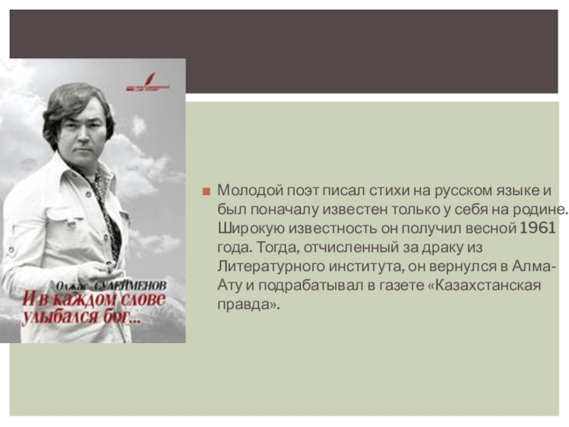 Слайд 20Олжаса Сулейменова причисляют к поэтам-шестидесятникам, его друзьями были три столпа тех