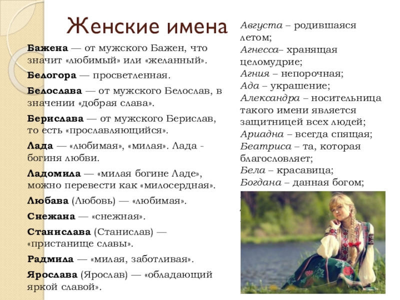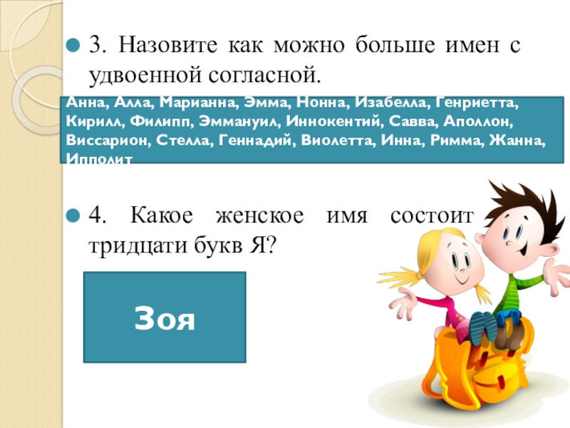 Анна, Алла, Марианна, Эмма, Нонна, Изабелла, Генриетта, Кирилл, Филипп, Эммануил, Иннокентий, Савва, Аполлон, Виссарион, Стелла, Геннадий, Виолетта, Инна, Римма, Жанна, Ипполит