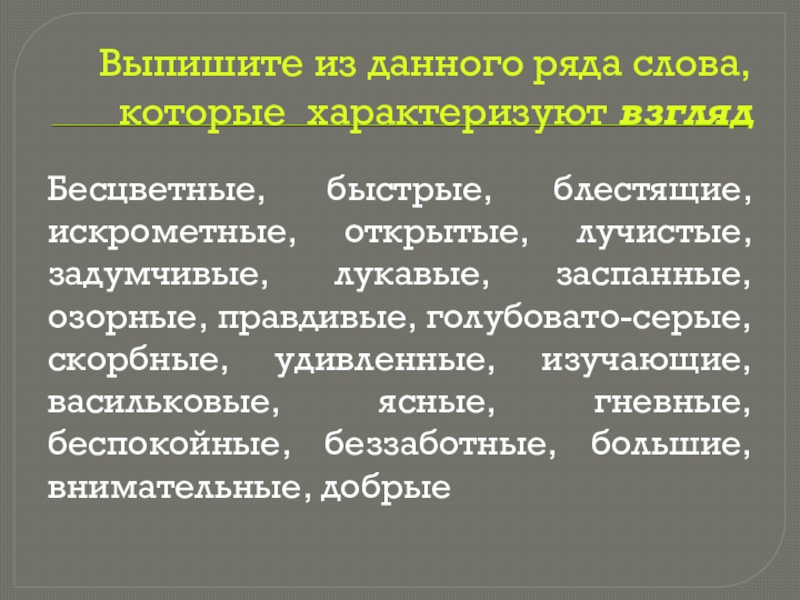 Слайд 16Выпишите из данного ряда слова, которые характеризуют взгляд