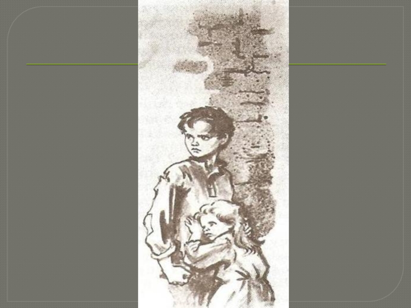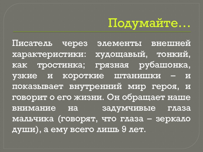 узкие и короткие штанишки – и показывает внутренний мир героя, и говорит о его жизни. Он обращает наше внимание на задумчивые глаза мальчика (говорят, что глаза – зеркало души), а ему всего лишь 9 лет.