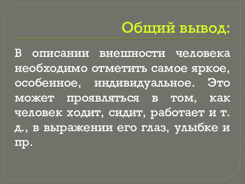 В описании внешности человека необходимо отметить самое яркое, особенное, индивидуальное.