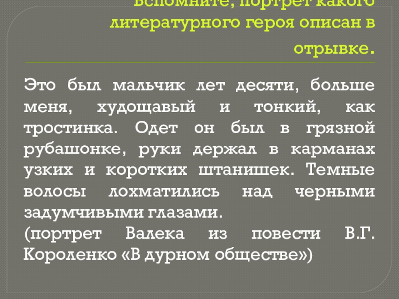 (портрет Валека из повести В.Г. Короленко «В дурном обществе»)