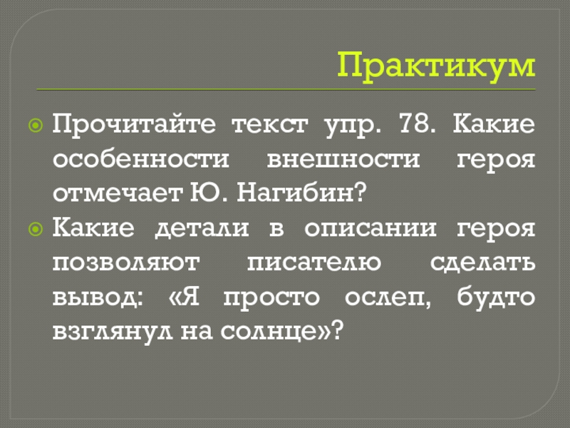 Прочитайте текст упр. 78. Какие особенности внешности героя отмечает Ю. Нагибин?