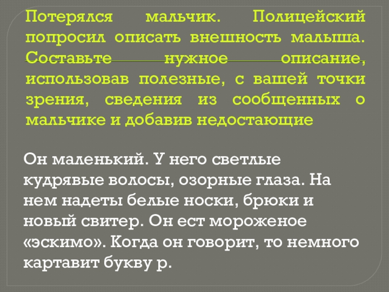 Слайд 15Потерялся мальчик. Полицейский попросил описать внешность малыша. Составьте нужное описание, использовав