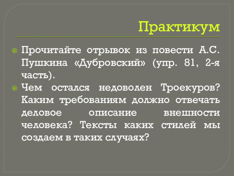 Чем остался недоволен Троекуров? Каким требованиям должно отвечать деловое описание внешности человека? Тексты каких стилей мы создаем в таких случаях?