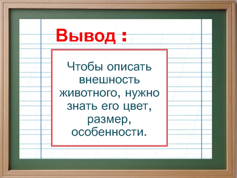 Вывод :Чтобы описать внешность животного, нужно знать его цвет, размер, особенности.