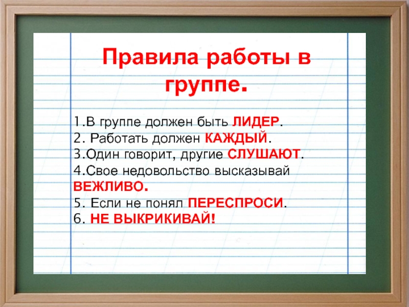 Правила работы в группе.1.В группе должен быть ЛИДЕР.2. Работать должен КАЖДЫЙ.3.Один говорит, другие СЛУШАЮТ.4.Свое недовольство высказывай ВЕЖЛИВО.5.