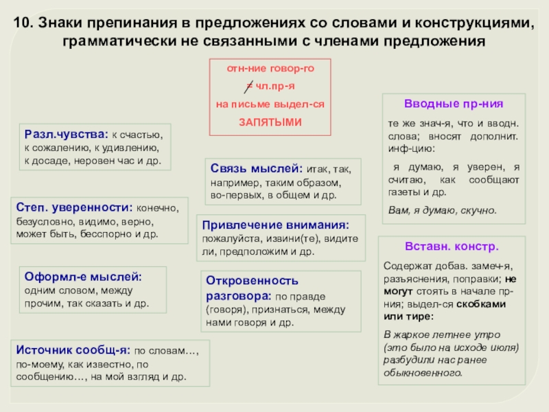 10. Знаки препинания в предложениях со словами и конструкциями, грамматически не связанными с членами предложения
