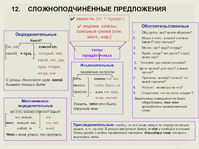 Присоединительные- сообщ. те или иные свед-я по поводу ситуации, выраж. в гл. пр-нии: Я решил вернуться домой, о чём и сообщил в письме. Отец привёз с войны трофейный патефон, благодаря чему сестра и выучилась петь.