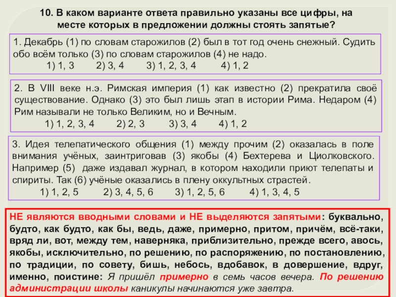 1. Декабрь (1) по словам старожилов (2) был в тот год очень снежный. Судить обо всём только (3) по словам старожилов (4) не надо.