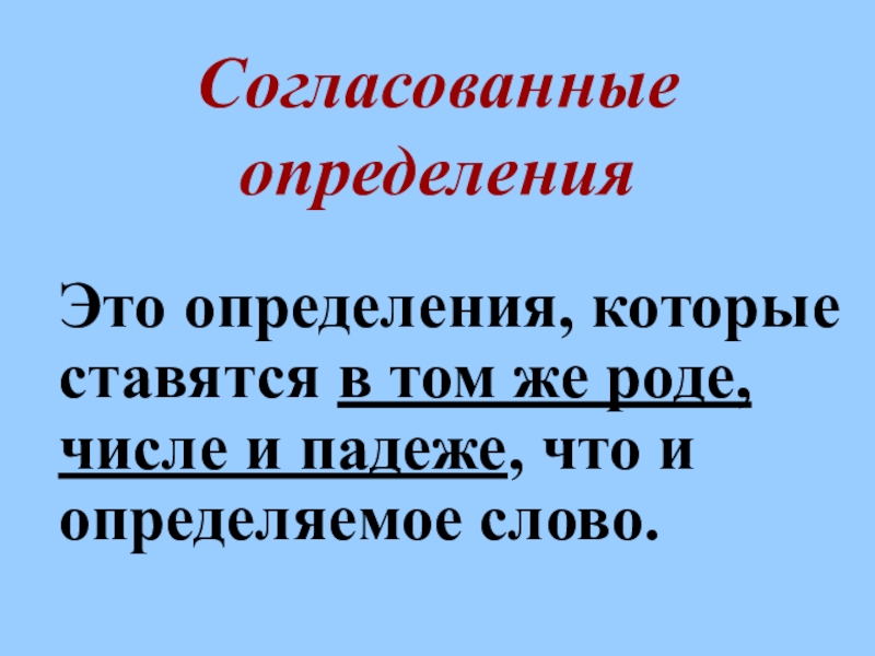 Согласованные определения Это определения, которые ставятся в том же роде, числе и падеже, что и определяемое слово.
