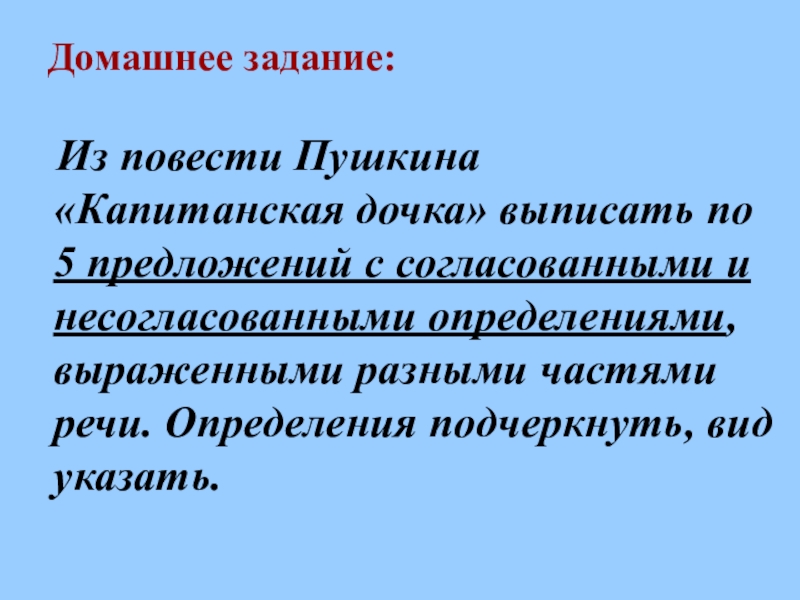 Домашнее задание:  Из повести Пушкина «Капитанская дочка» выписать по 5 предложений с согласованными и несогласованными определениями,