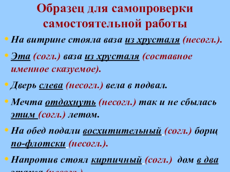 Образец для самопроверки самостоятельной работыНа витрине стояла ваза из хрусталя (несогл.).   Эта (согл.) ваза из