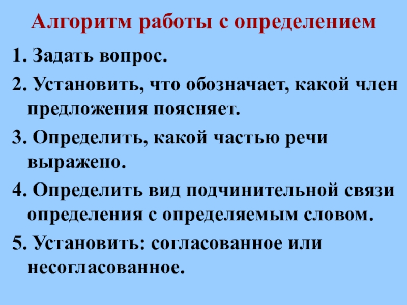 Алгоритм работы с определением1. Задать вопрос.2. Установить, что обозначает, какой член предложения поясняет.3. Определить, какой частью речи