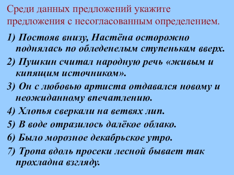 Среди данных предложений укажите предложения с несогласованным определением.1)	Постояв внизу, Настёна осторожно поднялась по обледенелым ступенькам вверх. 2)	Пушкин