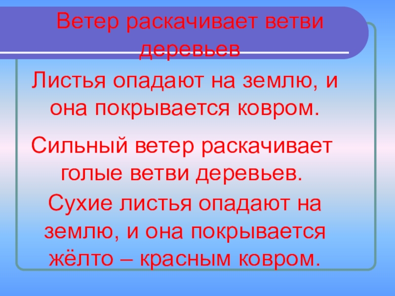 Сухие листья опадают на землю, и она покрывается жёлто – красным ковром.