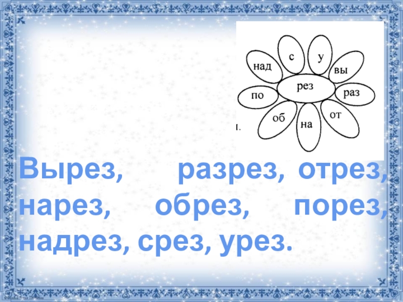 Вырез,       разрез, отрез, нарез, обрез, порез, надрез, срез, урез.