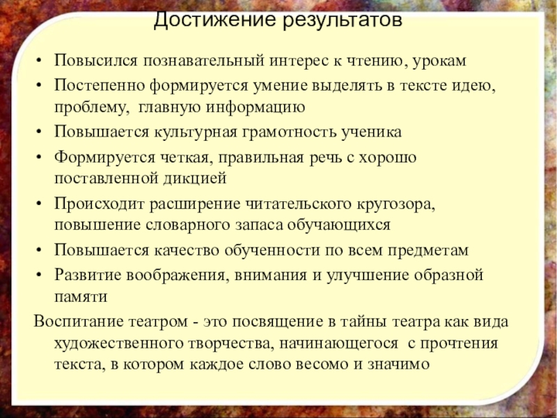 Воспитание театром - это посвящение в тайны театра как вида художественного творчества, начинающегося с прочтения текста, в котором каждое слово весомо и значимо
