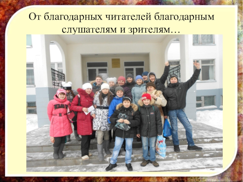 Слайд 20От благодарных читателей благодарным слушателям и зрителям…