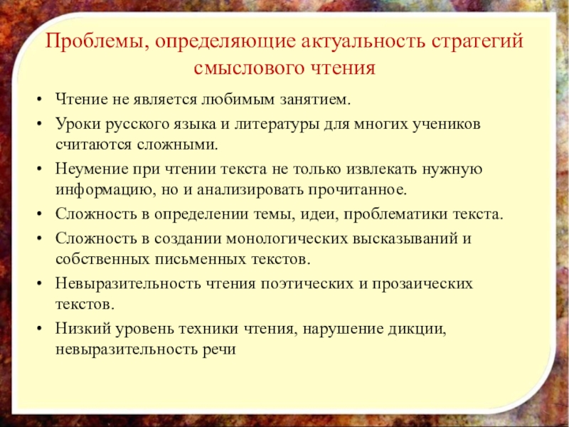Слайд 2Проблемы, определяющие актуальность стратегий смыслового чтения