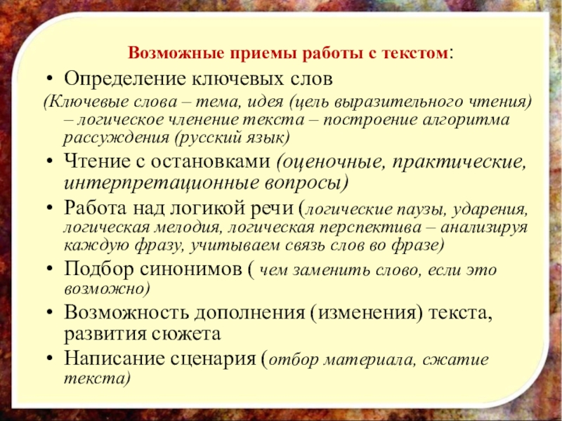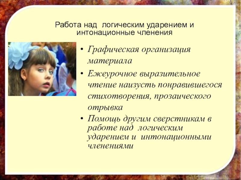Работа над логикой речи (логические паузы, ударения, логическая мелодия, логическая перспектива – анализируя каждую фразу, учитываем связь слов во фразе)