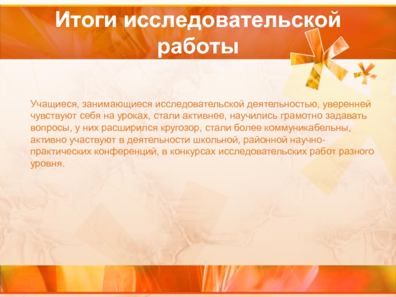 стали активнее, научились грамотно задавать вопросы, у них расширился кругозор, стали более коммуникабельны, активно участвуют в деятельности школьной, районной научно-практических конференций, в конкурсах исследовательских работ разного уровня.