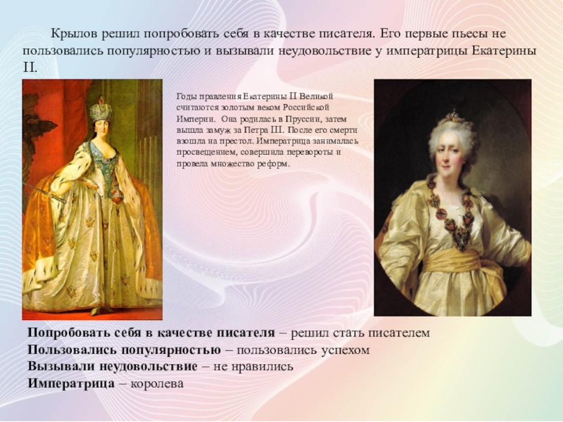 Годы правления Екатерины II Великой считаются золотым веком Российской Империи. Она родилась в Пруссии, затем вышла замуж за Петра III. После его смерти взошла на престол. Императрица занималась просвещением, совершила перевороты и провела множество реформ.