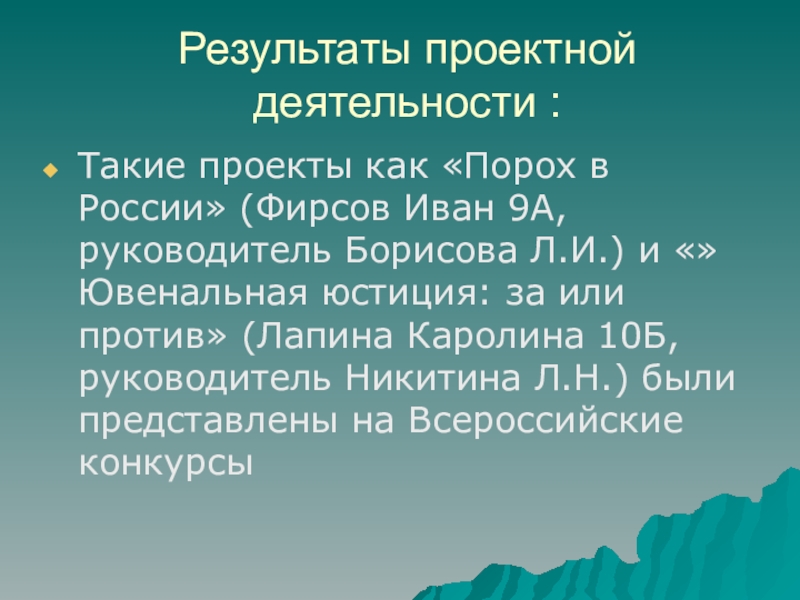 9А, руководитель Борисова Л.И.) и «»Ювенальная юстиция: за или против» (Лапина Каролина 10Б, руководитель Никитина Л.Н.) были представлены на Всероссийские конкурсы
