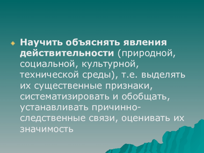 Научить объяснять явления действительности (природной, социальной, культурной, технической среды), т.е. выделять