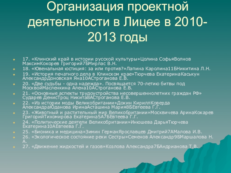 Слайд 17Организация проектной деятельности в Лицее в 2010- 2013 годы