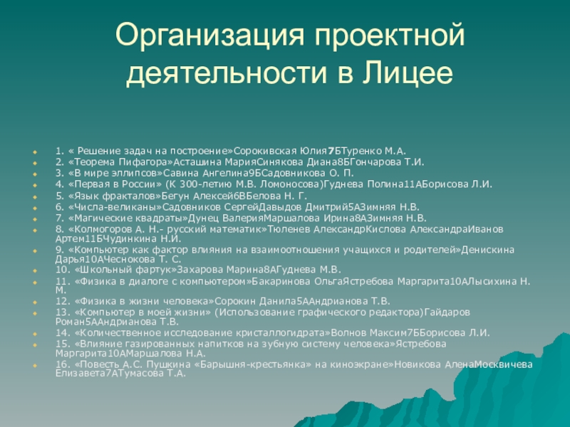 Слайд 16Организация проектной деятельности в Лицее