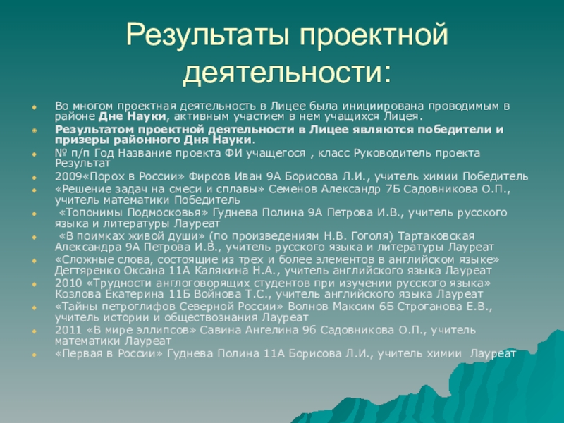 Результатом проектной деятельности в Лицее являются победители и призеры районного Дня Науки.