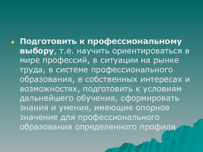 ситуации на рынке труда, в системе профессионального образования, в собственных интересах и возможностях, подготовить к условиям дальнейшего обучения, сформировать знания и умения, имеющие опорное значение для профессионального образования определенного профиля