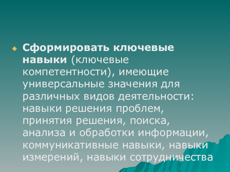Сформировать ключевые навыки (ключевые компетентности), имеющие универсальные значения для различных видов