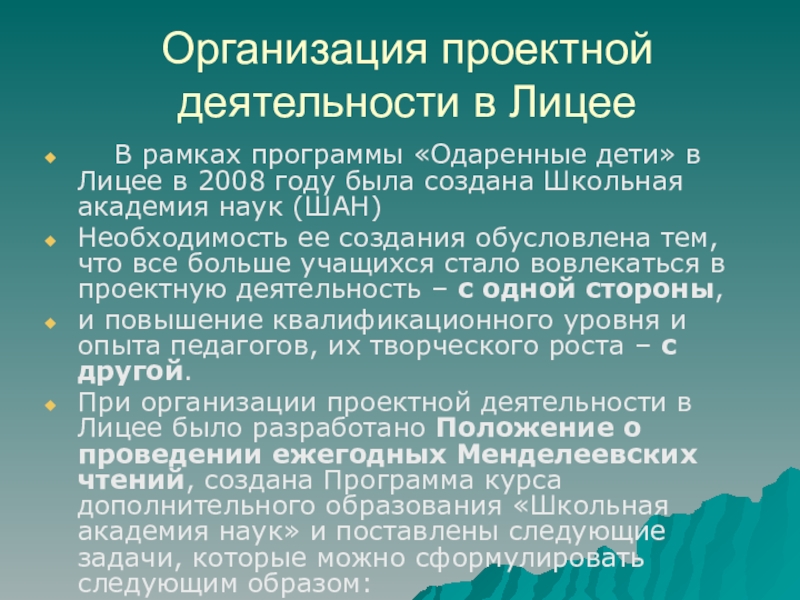 При организации проектной деятельности в Лицее было разработано Положение о проведении ежегодных Менделеевских чтений, создана Программа курса дополнительного образования «Школьная академия наук» и поставлены следующие задачи, которые можно сформулировать следующим образом: