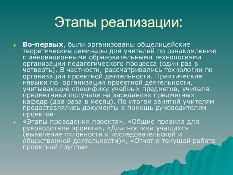 с инновационными образовательными технологиями организации педагогического процесса (один раз в четверть). В частности, рассматривались технологии по организации проектной деятельности. Практические навыки по организации проектной деятельности, учитывающие специфику учебных предметов, учителя-предметники получали на заседаниях предметных кафедр (два раза в месяц). По итогам занятий учителям предоставлялись документы в помощь руководителям проектов: