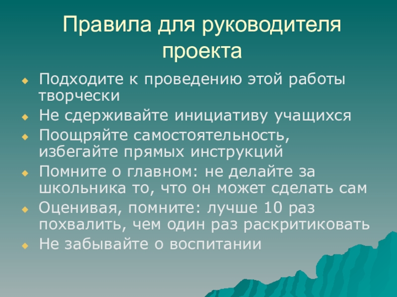 Слайд 22Правила для руководителя проекта