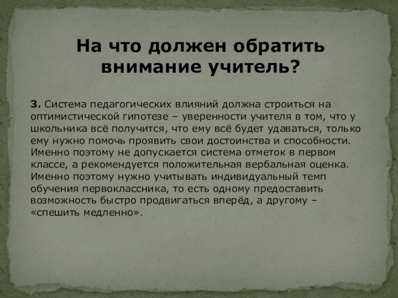 оптимистической гипотезе – уверенности учителя в том, что у школьника всё получится, что ему всё будет удаваться, только ему нужно помочь проявить свои достоинства и способности. Именно поэтому не допускается система отметок в первом классе, а рекомендуется положительная вербальная оценка. Именно поэтому нужно учитывать индивидуальный темп обучения первоклассника, то есть одному предоставить возможность быстро продвигаться вперёд, а другому – «спешить медленно».