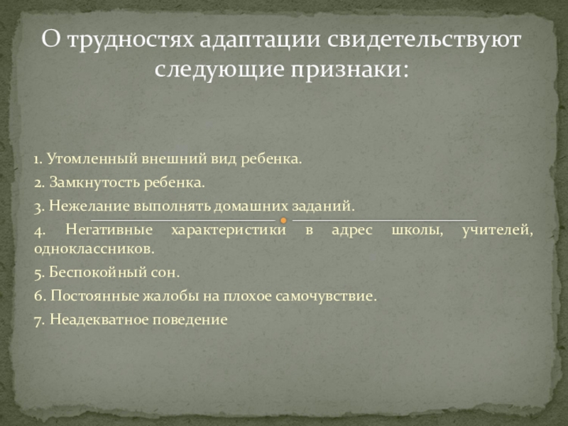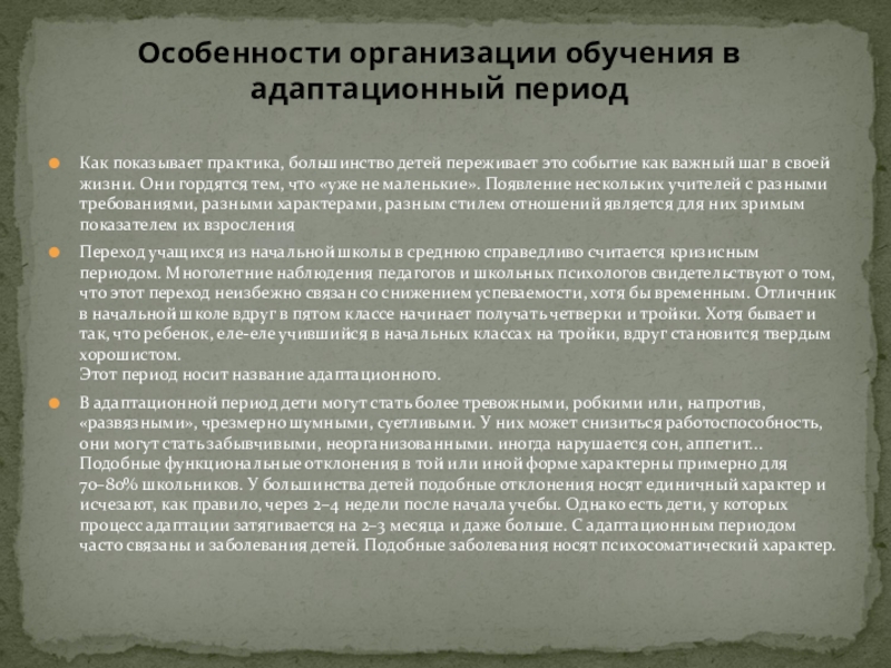 В адаптационной период дети могут стать более тревожными, робкими или, напротив, «развязными», чрезмерно шумными, суетливыми. У них может снизиться работоспособность, они могут стать забывчивыми, неорганизованными. иногда нарушается сон, аппетит... Подобные функциональные отклонения в той или иной форме характерны примерно для 70–80% школьников. У большинства детей подобные отклонения носят единичный характер и исчезают, как правило, через 2–4 недели после начала учебы. Однако есть дети, у которых процесс адаптации затягивается на 2–3 месяца и даже больше. С адаптационным периодом часто связаны и заболевания детей. Подобныe заболевания носят психосоматический характер.