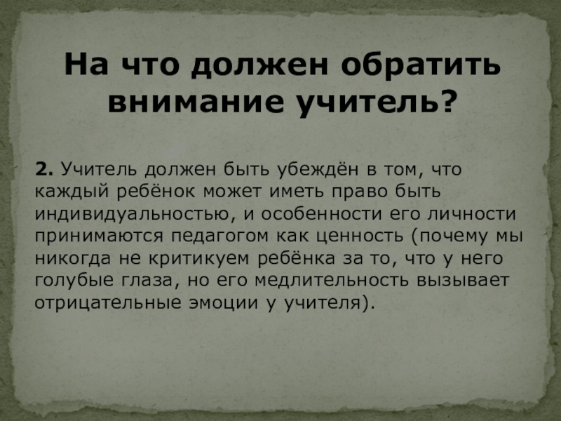 что каждый ребёнок может иметь право быть индивидуальностью, и особенности его личности принимаются педагогом как ценность (почему мы никогда не критикуем ребёнка за то, что у него голубые глаза, но его медлительность вызывает отрицательные эмоции у учителя).