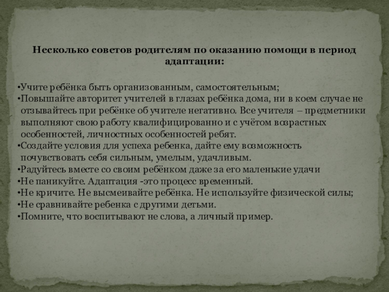 Слайд 9Несколько советов родителям по оказанию помощи в период адаптации: