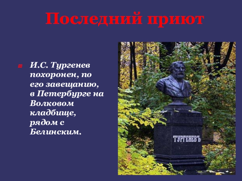 И.С. Тургенев похоронен, по его завещанию, в Петербурге на Волковом