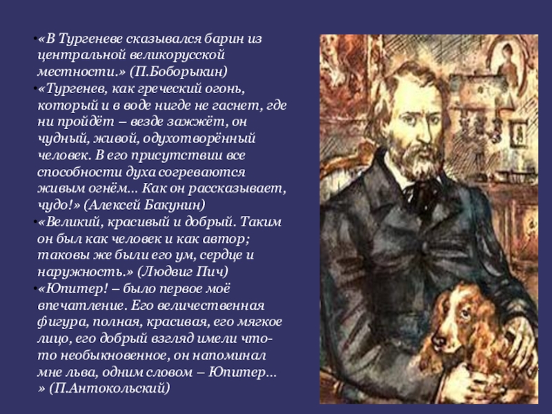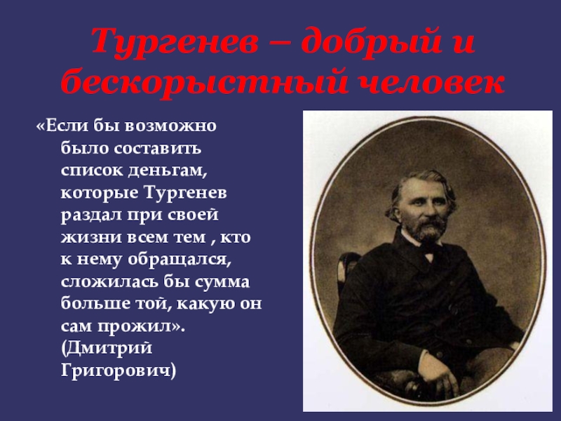 Слайд 9Тургенев – добрый и бескорыстный человек